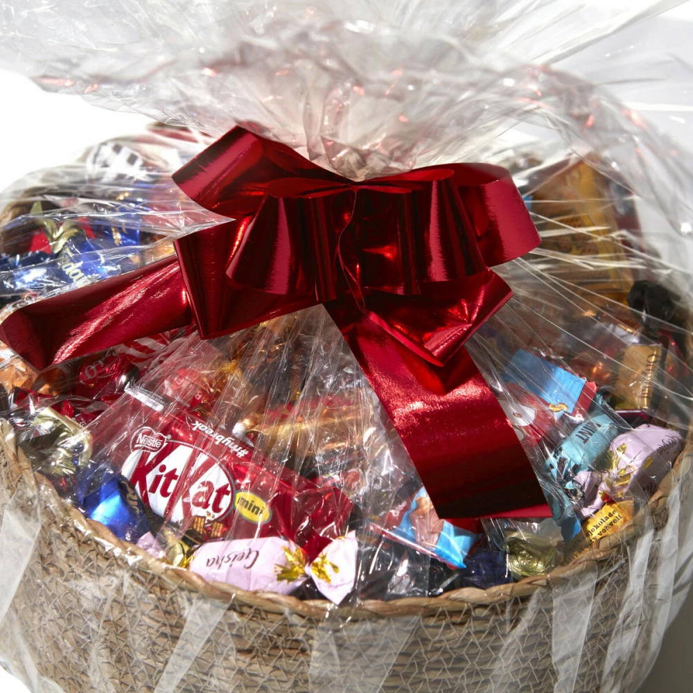 Timeless Christmas baskets, an updated classic that can be used again and again. The perfect decorative detail for any season and occasion, at home or in the office. Each basket is wrapped in beautiful cellophane with a red bow.
